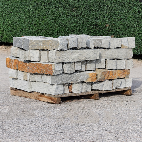 Tennessee Medium Stack Veneer is a fieldstone sourced from the east-central region of Tennessee. Medium Stack Veneer has a natural color palette mixture of earthy tones that consist of different shades of browns, greens rusty colors and golden hues. Our pallets weigh approximately 1.8 tons (3600 lbs) with a coverage area of approximately 64 square feet. The pieces range in size from 6" to 11" in length and 3" to 6" in height. These can be cut or chiseled to desired size. These pieces are perfect for covering block masonry, fireplaces, indoor/outdoor hardscapes, water features and ponds, wall caps, garden borders and more. Please note: This is a natural product, so colors may vary. We deliver within a 60-mile radius around the Metro Atlanta area for one flat-rate fee per delivery. Price Per Pallet: